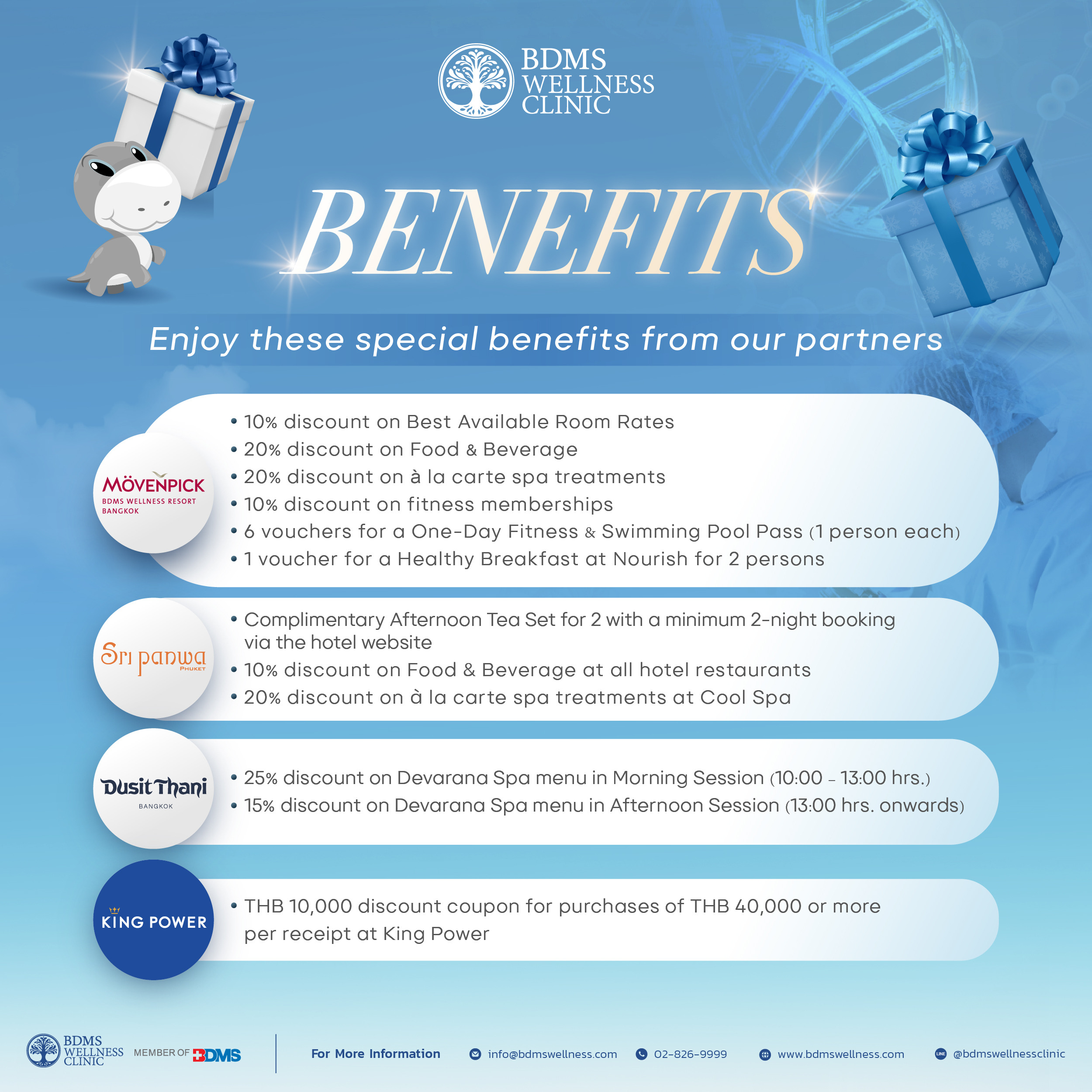 - BDMS Wellness Clinic and its participating partners reserve the right to amend, modify, or withdraw any benefits without prior notice.
