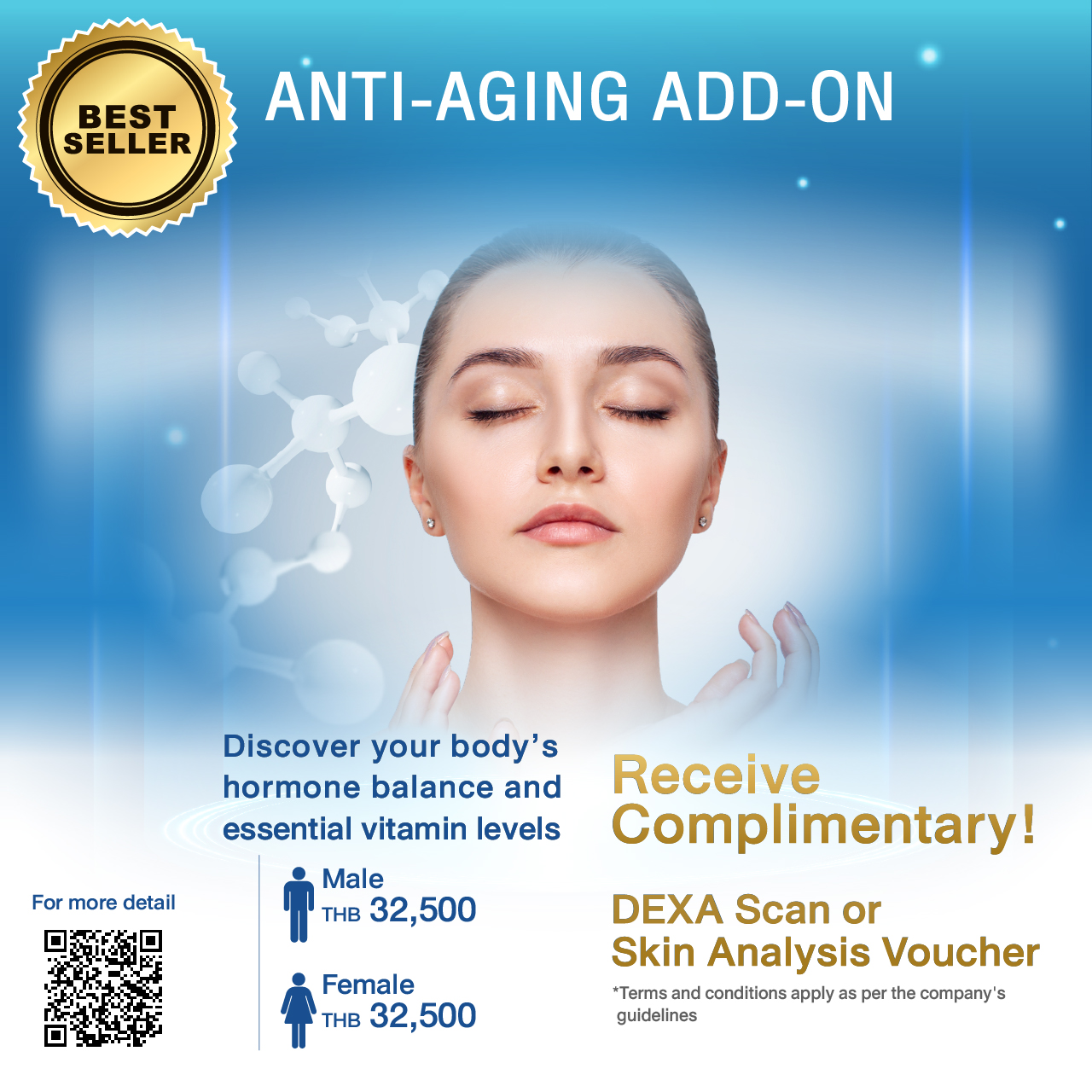 - Anti-Aging Add-On Male/Female Special Price: 32,500 THB Bonus! Get a complimentary DEXA Scan or Skin Analysis Voucher when purchasing this package!