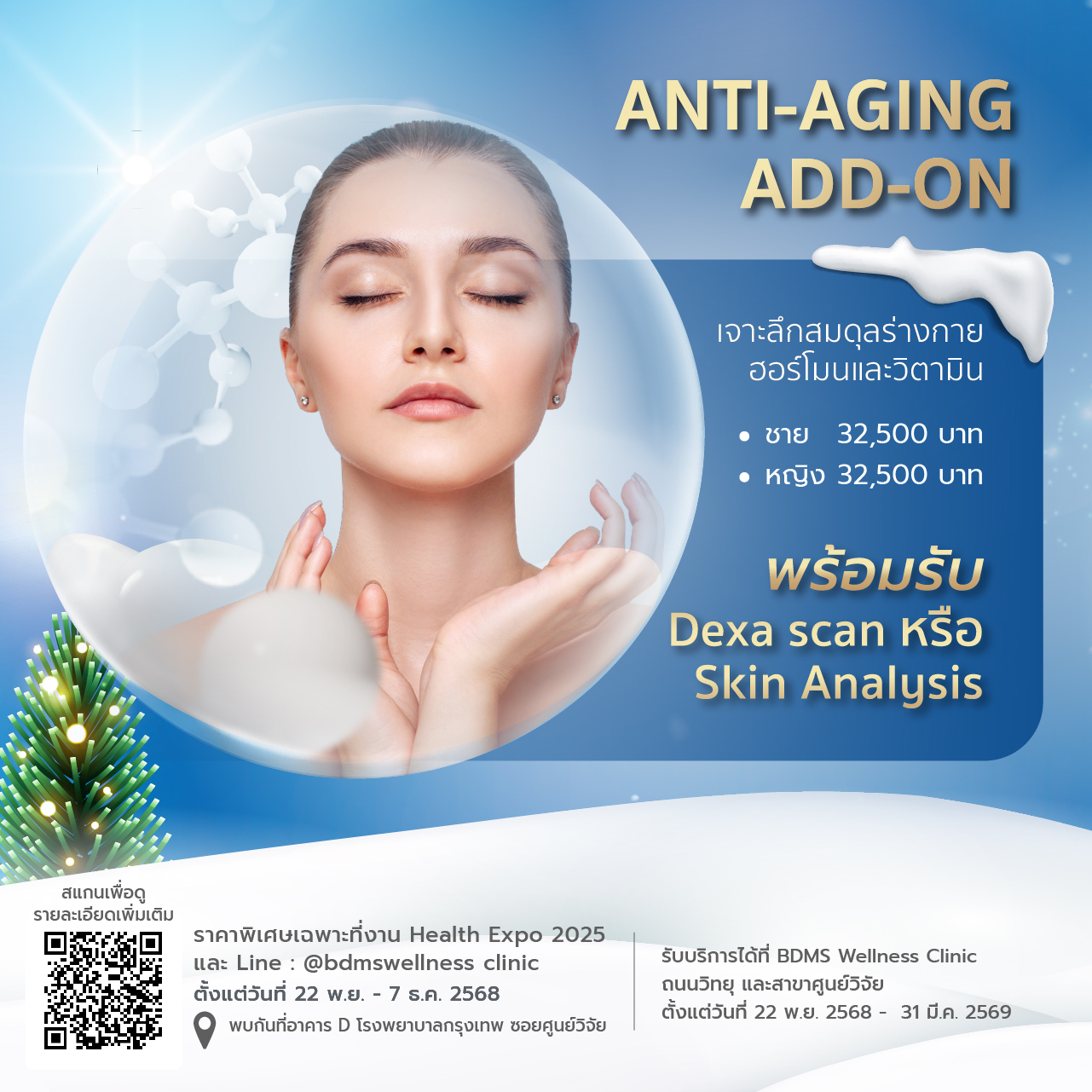 - Anti-Aging Add-On Male/Female ราคา 32,500 บาท แถมวอยเชอร์ Dexa scan หรือ Skin Analysis