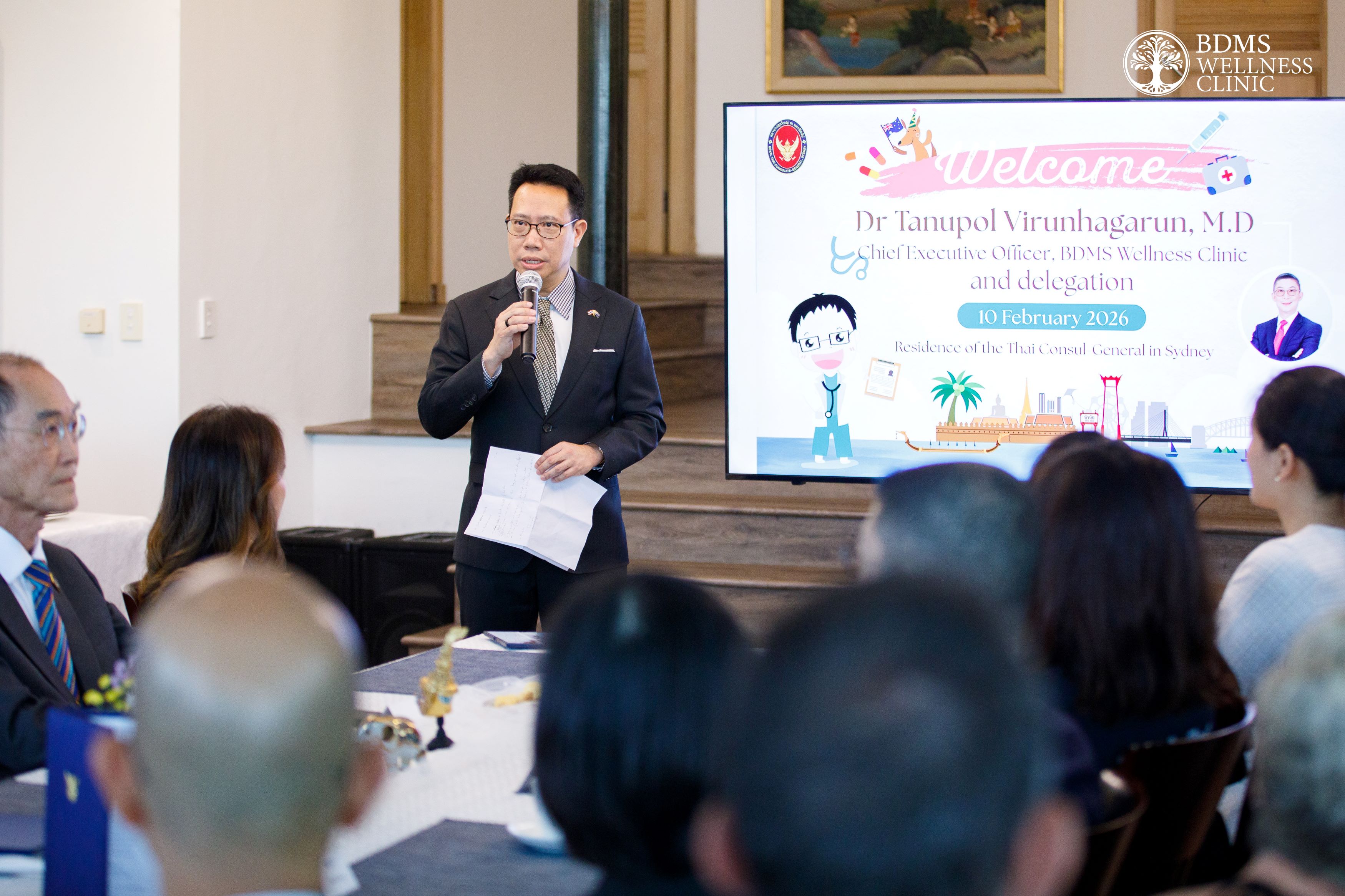 กรุงเทพฯ, ประเทศไทย – 20 กุมภาพันธ์ 2569 – บีดีเอ็มเอส เวลเนส คลินิก (BDMS Wellness Clinic) ศูนย์สุขภาพเชิงป้องกันในเครือบริษัท กรุงเทพดุสิตเวชการ จำกัด (มหาชน) หรือ BDMS นำโดย นายแพทย์ ตนุพล วิรุฬหการุญ หรือ “คุณหมอแอมป์” ประธานคณะผู้บริหาร บีดีเอ็มเอส เวลเนส คลินิก และ บีดีเอ็มเอส เวลเนส รีสอร์ท บริษัท กรุงเทพดุสิตเวชการ จำกัด (มหาชน) เดินหน้าขยายโมเดล Wellness Ecosystem ของไทยอย่างต่อเนื่อง โดยได้รับเกียรติจาก นายนฤชัย นินนาท กงสุลใหญ่ ณ นครซิดนีย์ เป็นประธานกล่าวเปิดงาน ในวันนี้ นายแพทย์ตนุพล ได้บรรยายในหัวข้อ “Wellness Hub Thailand: The Future of Global Wellness” สะท้อนแนวทางการบูรณาการองค์ความรู้ด้าน สุขภาวะ การท่องเที่ยว และวิถีชีวิต เพื่อสนับสนุนการสร้างสุขภาวะอย่างยั่งยืนในระดับนานาชาติ การแลกเปลี่ยนองค์ความรู้ในครั้งนี้เกิดขึ้นท่ามกลางบริบทที่ทั่วโลก รวมถึงประเทศที่มีระบบสาธารณสุขก้าวหน้าอย่างออสเตรเลีย กำลังเผชิญความท้าทายจากโรคไม่ติดต่อเรื้อรัง (Non-Communicable Diseases: NCDs) ซึ่งเป็นสาเหตุของการเสียชีวิตมากกว่า 90% ของประชากรทั้งหมด สะท้อนให้เห็นว่าความก้าวหน้าทางการแพทย์เพียงอย่างเดียวอาจไม่เพียงพอ หากปราศจากแนวทางการดูแลสุขภาพเชิงป้องกันและการส่งเสริมคุณภาพชีวิตอย่างเป็นระบบ ภายในงาน มีผู้แทนจากภาครัฐ ภาคธุรกิจ และภาคการท่องเที่ยวเข้าร่วมอย่างคับคั่ง อาทิ การท่องเที่ยวแห่งประเทศไทย สำนักนครซิดนีย์, กรมส่งเสริมการค้าระหว่างประเทศ กระทรวงพาณิชย์, ผู้อำนวยการสำนักงานเศรษฐกิจการลงทุน ณ นครซิดนีย์ และตัวแทนจากภาคธุรกิจอื่น ๆ อีกมากมาย สะท้อนถึงความสนใจและโอกาสความร่วมมือระหว่างไทยและออสเตรเลียในการขับเคลื่อนอนาคตสุขภาวะในเวทีโลก จากประเทศคุณภาพชีวิตสูง สู่วิกฤตสุขภาพเรื้อรัง: ออสเตรเลียเผชิญโจทย์ใหญ่ NCDs เมื่อกว่า 90% ของการเสียชีวิตมาจากโรคไม่ติดต่อเรื้อรัง และประชากรกว่า 17 ล้านคนมีภาวะน้ำหนักเกินและอ้วน