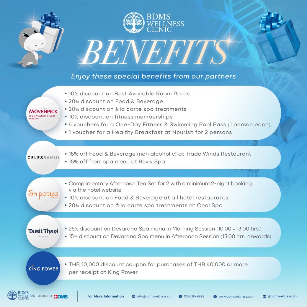 - BDMS Wellness Clinic and its participating partners reserve the right to amend, modify, or withdraw any benefits without prior notice.