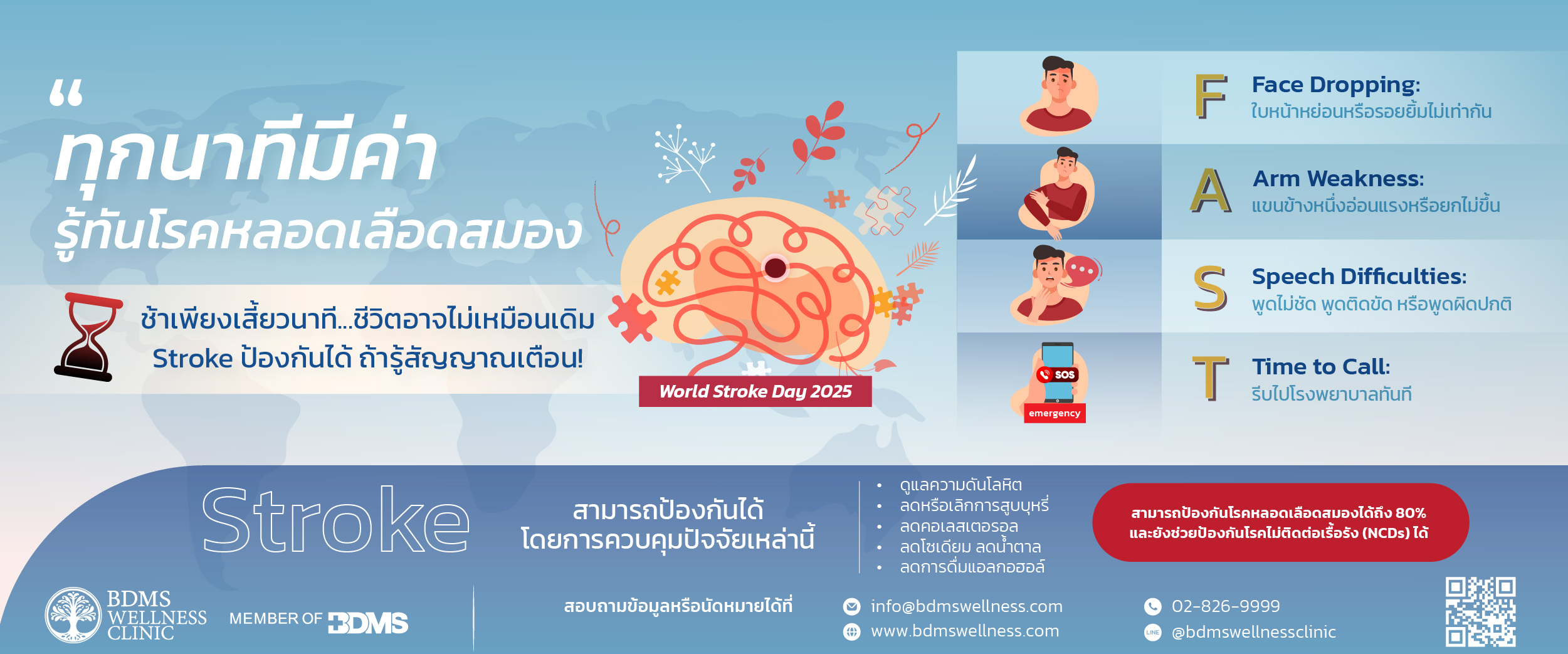 เนื่องในวันที่ 29 ตุลาคม ซึ่งตรงกับวันหลอดเลือดสมองโลก 2025 ภายใต้ธีมประจำปีนี้ “Every Minute Counts” เราขอเชิญชวนทุกคนให้ร่วมกันตระหนักถึงความสำคัญของการรู้ทันสัญญาณอันตราย และเข้ารับการรักษาอย่างทันท่วงที ร่วมกับการสร้างพฤติกรรมสุขภาพที่ดี เพื่อหยุดยั้งการเพิ่มขึ้นของผู้ป่วยโรคหลอดเลือดสมอง