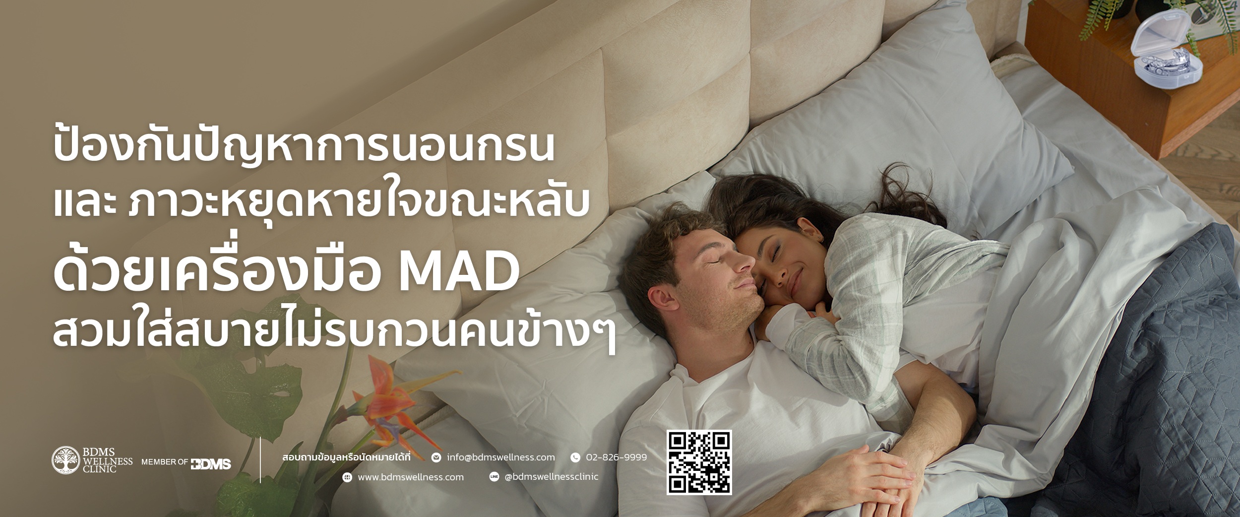 อย่าปล่อยให้การนอนหลับทำลายสุขภาพของคุณและคนที่คุณรัก... คืนลมหายใจที่โล่งสบายและคุณภาพการนอนหลับที่ดีอีกครั้ง ด้วยนวัตกรรม เครื่องมือ MAD (Mandibular Advancement Device) ทันตกรรมแก้นอนกรนที่ออกแบบเฉพาะบุคคลโดยทันตแพทย์เฉพาะทาง ที่ BDMS Wellness Clinic